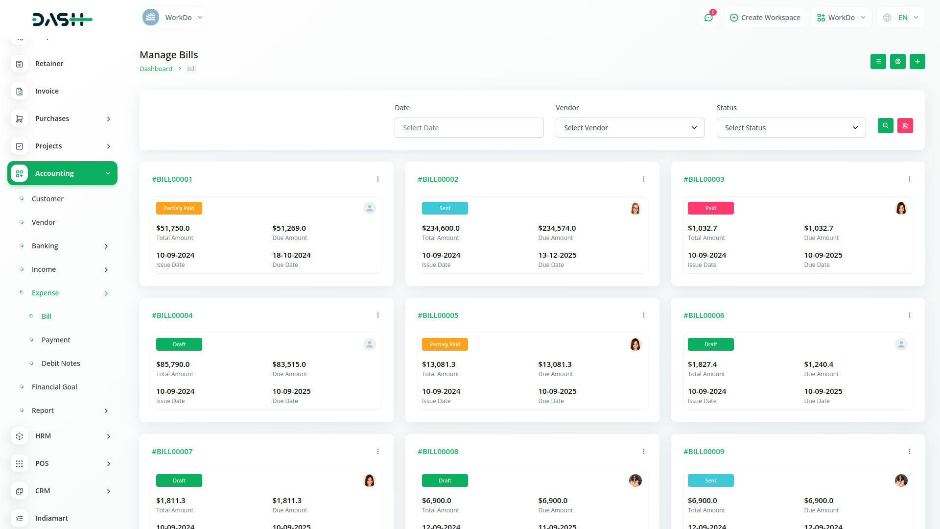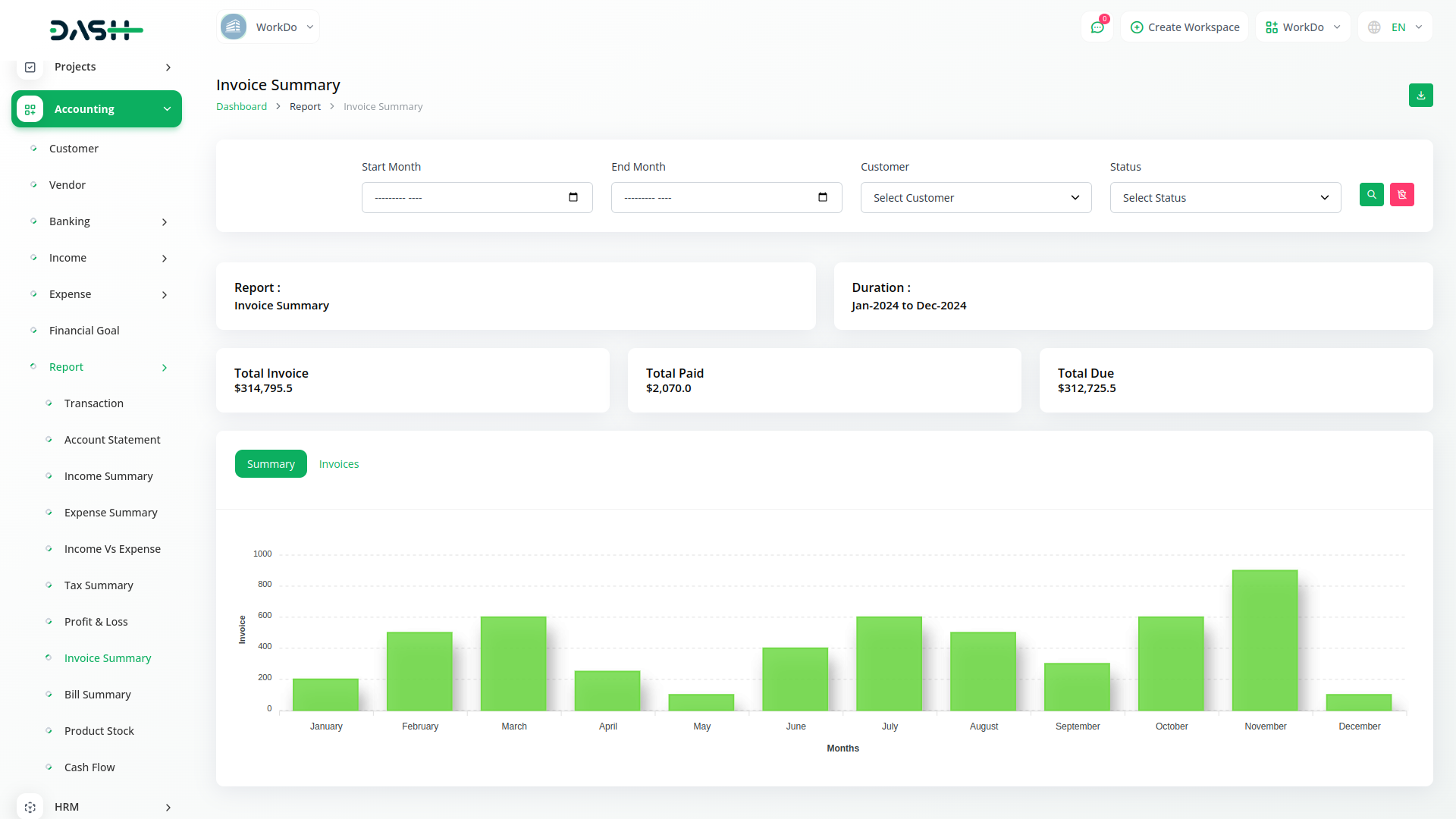 Instantly generate and filter reports to gain a clear view of your business's financial health. Download detailed account statements in PDF, CSV, or Excel format. Get quick access to reports on Income, Expenses, Taxes, Invoices, and Bill summaries, with the flexibility to filter by account, category, or customer. A graphical display of Income vs. Expense, along with a detailed Profit and Loss calculation, provides the insights you need to make smarter decisions.