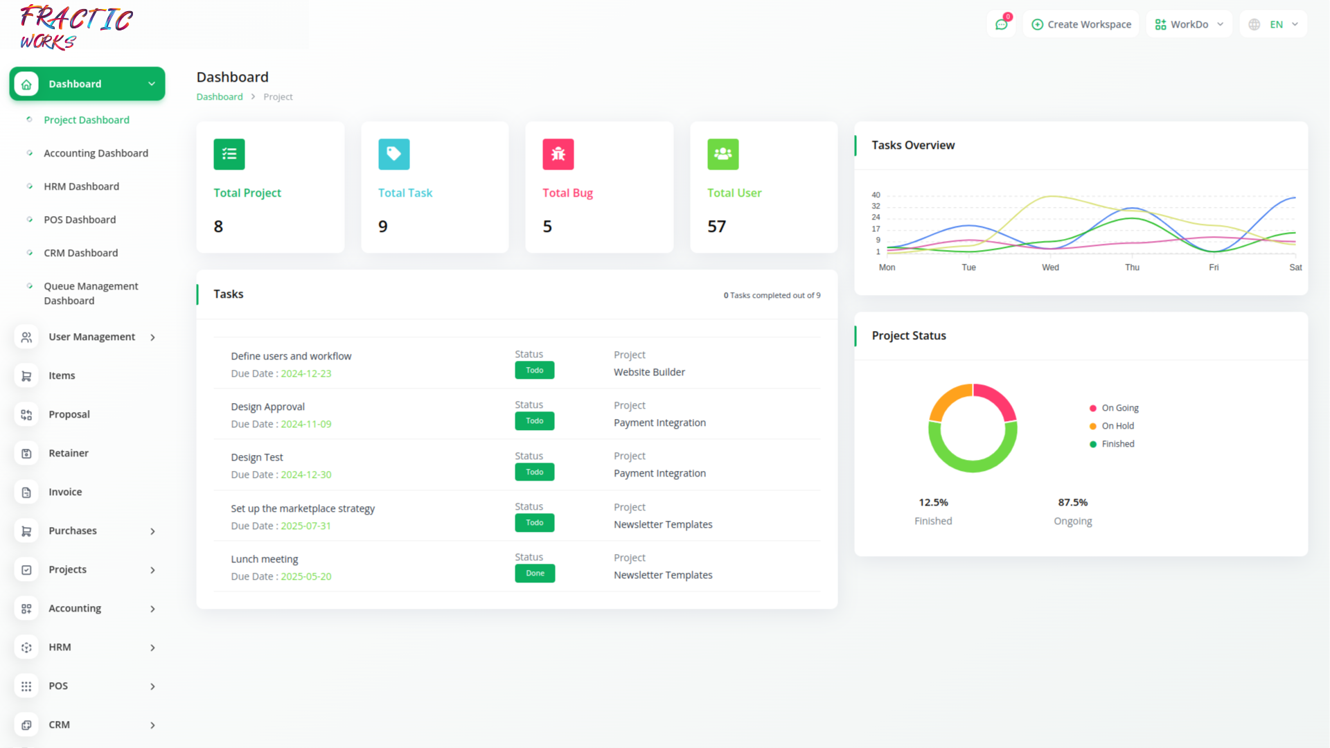 Get a complete overview of your projects, tasks, bugs, and team members from one centralized dashboard. Our visual task overview and project status features help you easily track progress on each task and stay on top of all deadlines to ensure a successful outcome.